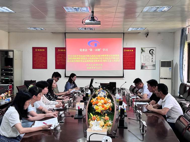 [经管学院 讯]2025年9月22日为深刻领会伟大抗战精神的时代价值,凝聚奋进力量,近日,学院党委理论学习中心组以第一议题形式,专题学习习近平总书记在纪念中国人民抗日战争暨世界反法西斯战争胜利80周年招待会及纪念大会上的重要讲话,党委书记梁标同志主持会议并领学,党委理论学习中心组成员全程参会研讨。