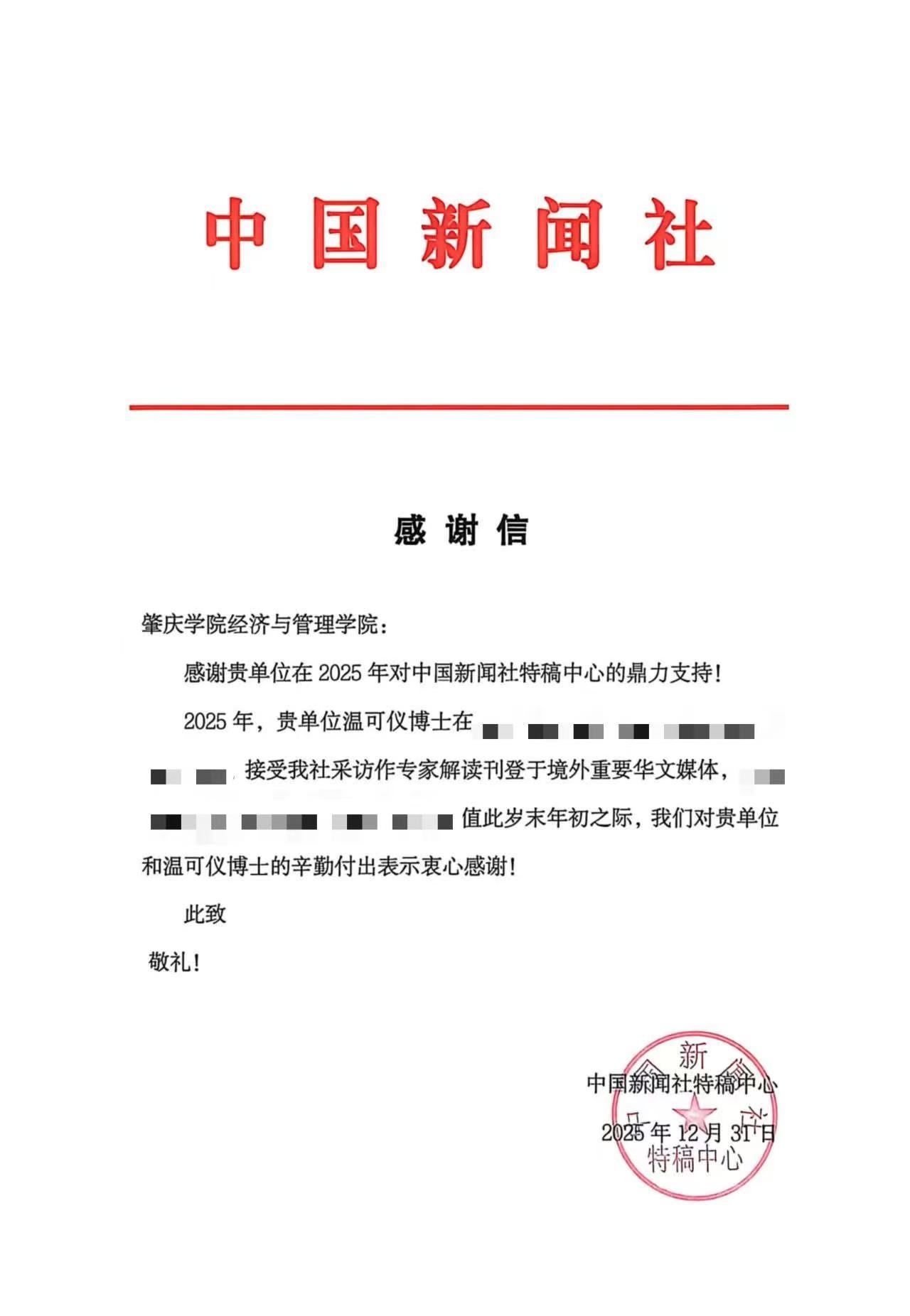 中国新闻社是我国重要的对外传播机构,在国际传播和海外华文媒体报道中具有广泛影响力。此次感谢信既是对两位教师专业素养和学术影响力的肯定,也体现了学院在服务国家需求、参与国际传播实践方面的学科优势与责任担当。