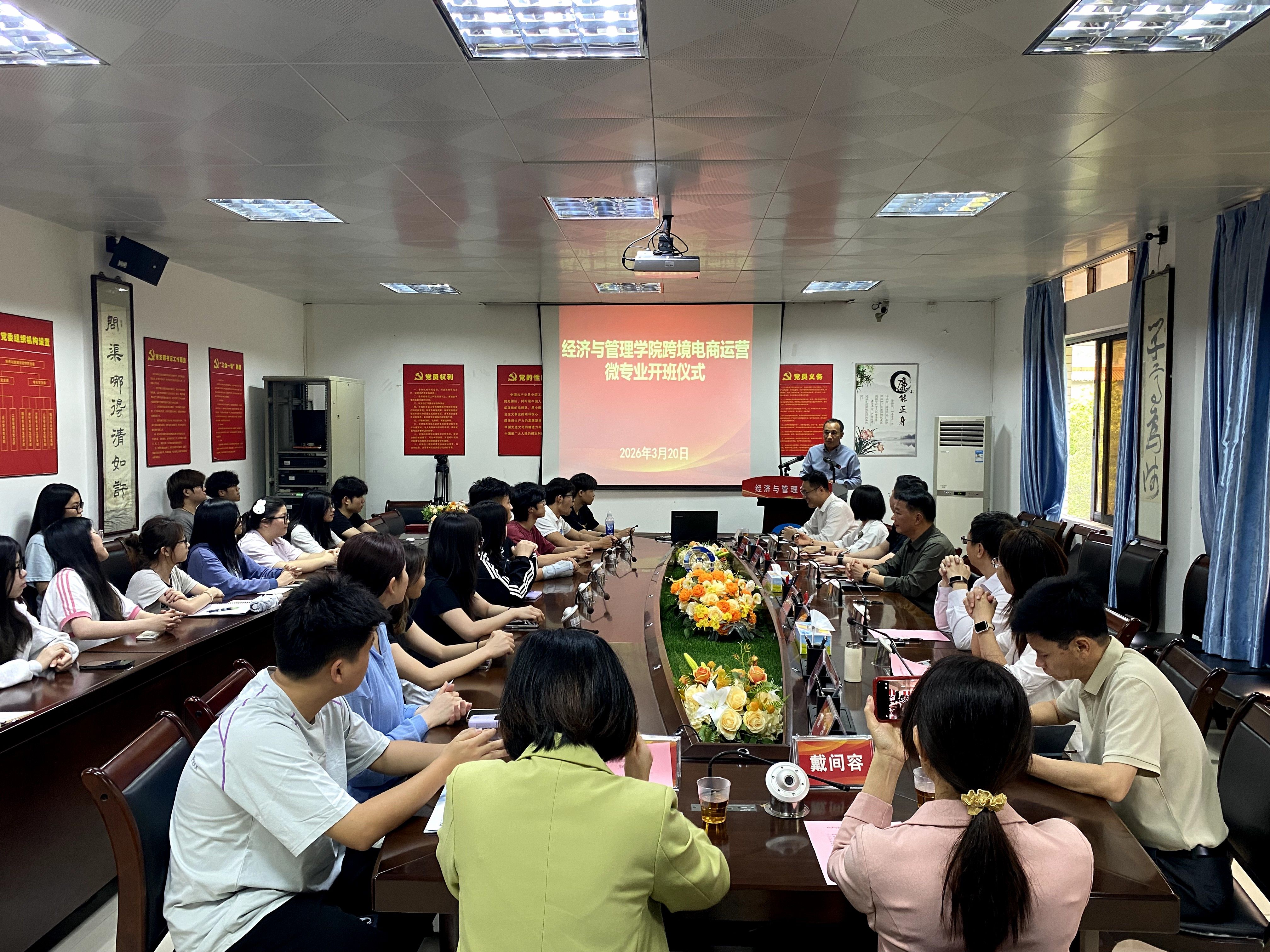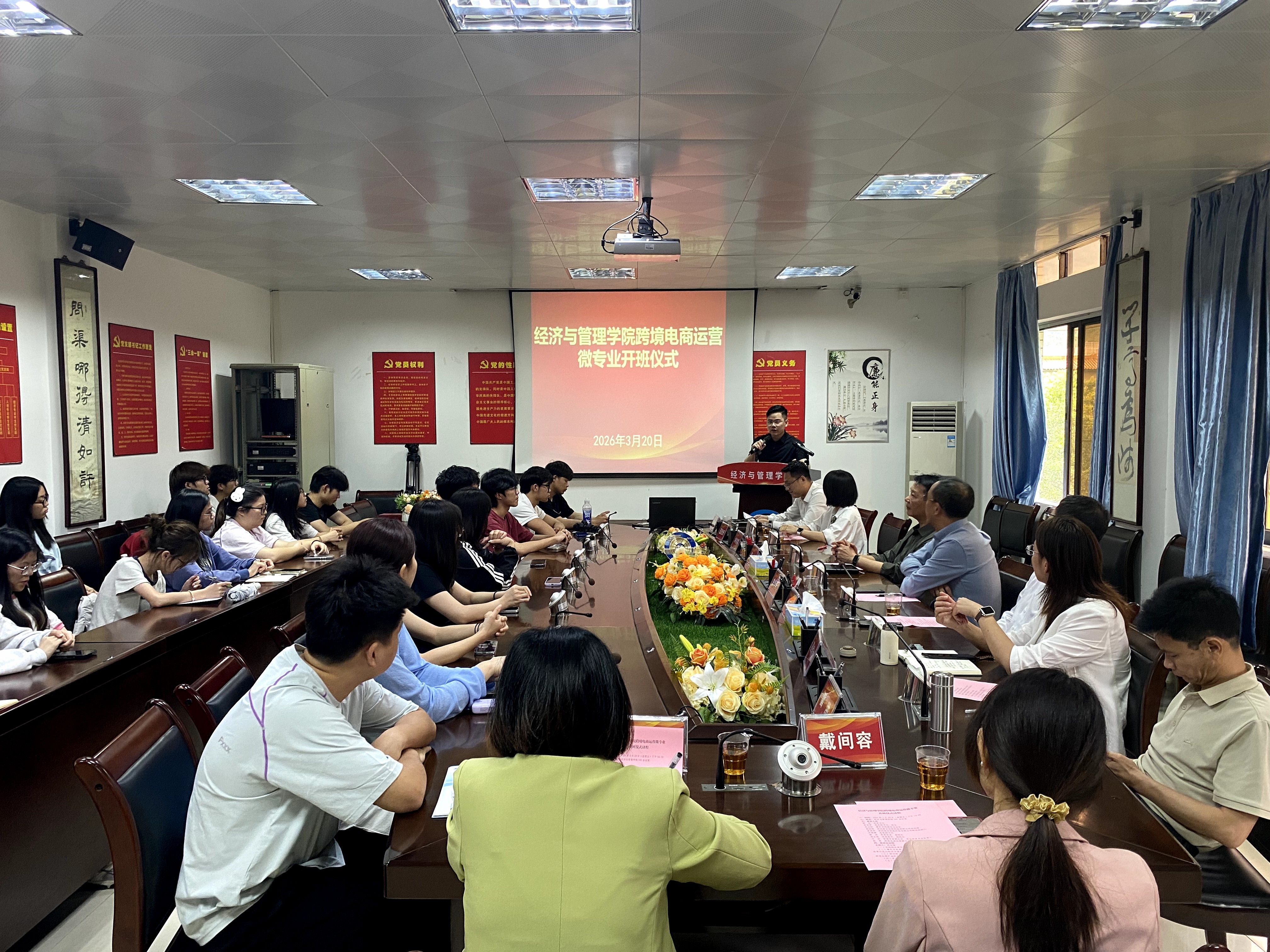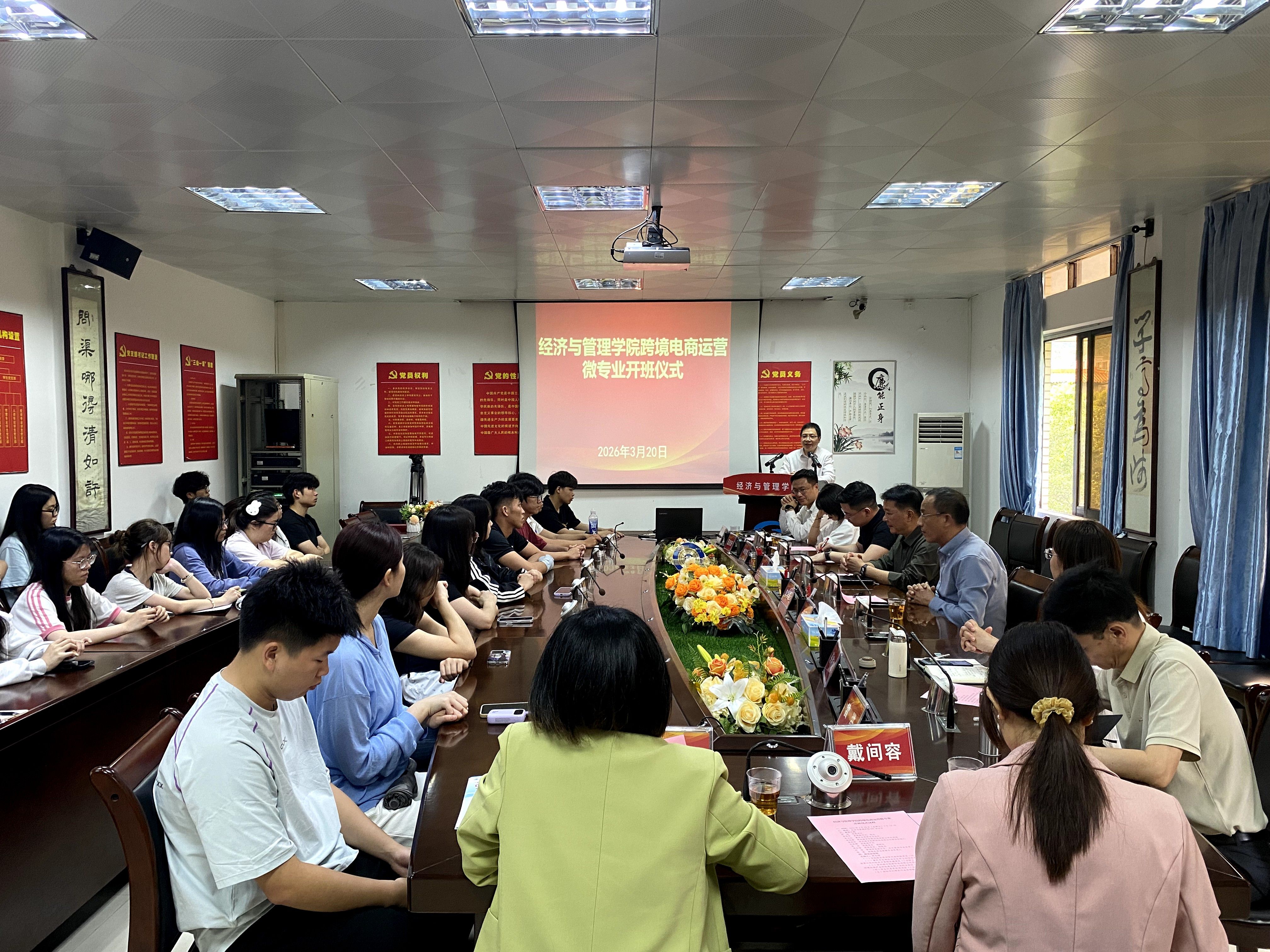 3月20日,经济与管理学院举行跨境电商运营微专业开班仪式。学院全体领导班子成员、专业负责人和班主任等出席仪式,肇庆市网商协会会长朱云初、深圳骅宇创新科技有限公司总经理林旭填、联合创始人蓝进好等行业导师应邀参加并分享发言。仪式由学院副院长周长锋主持。