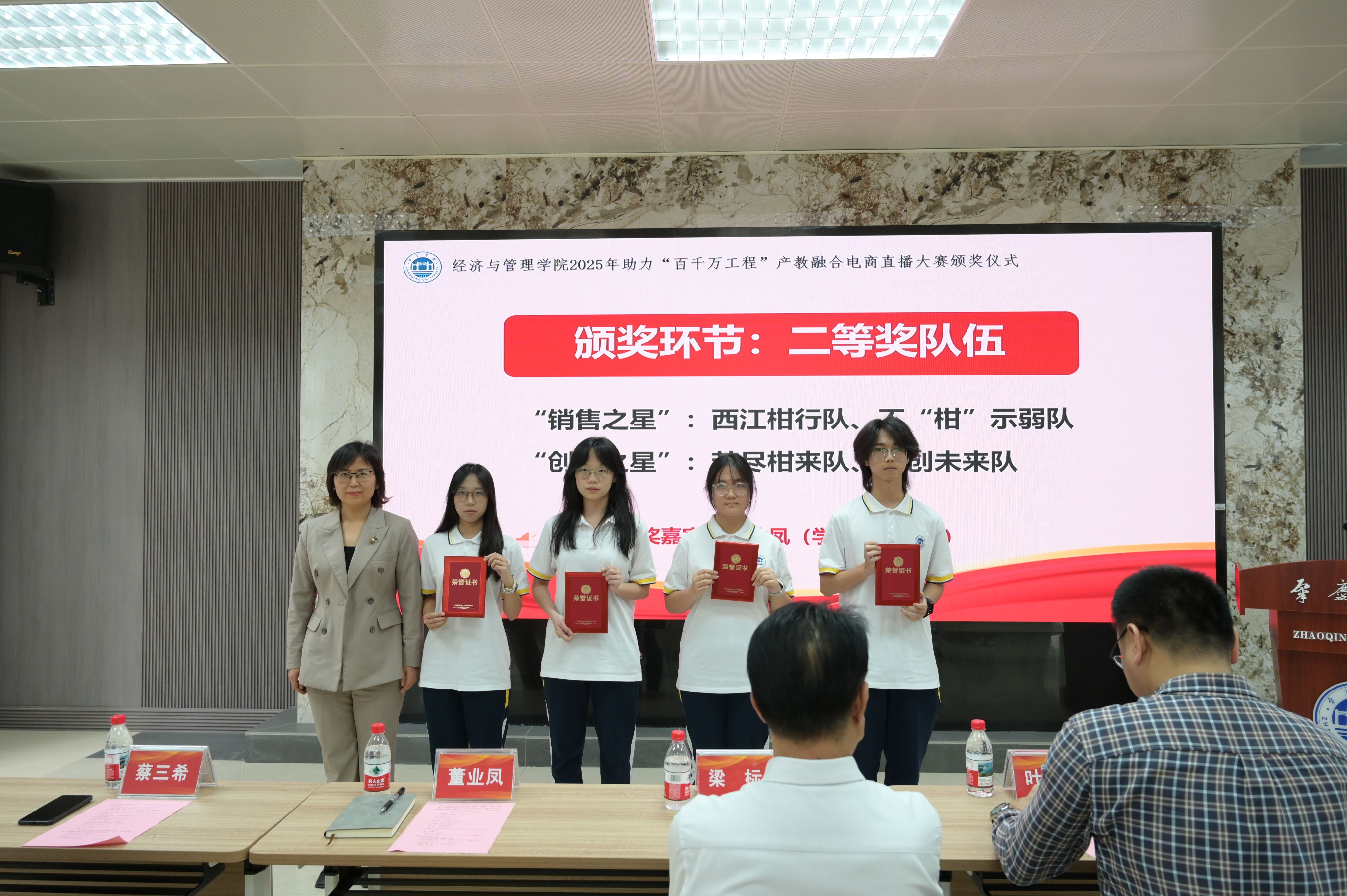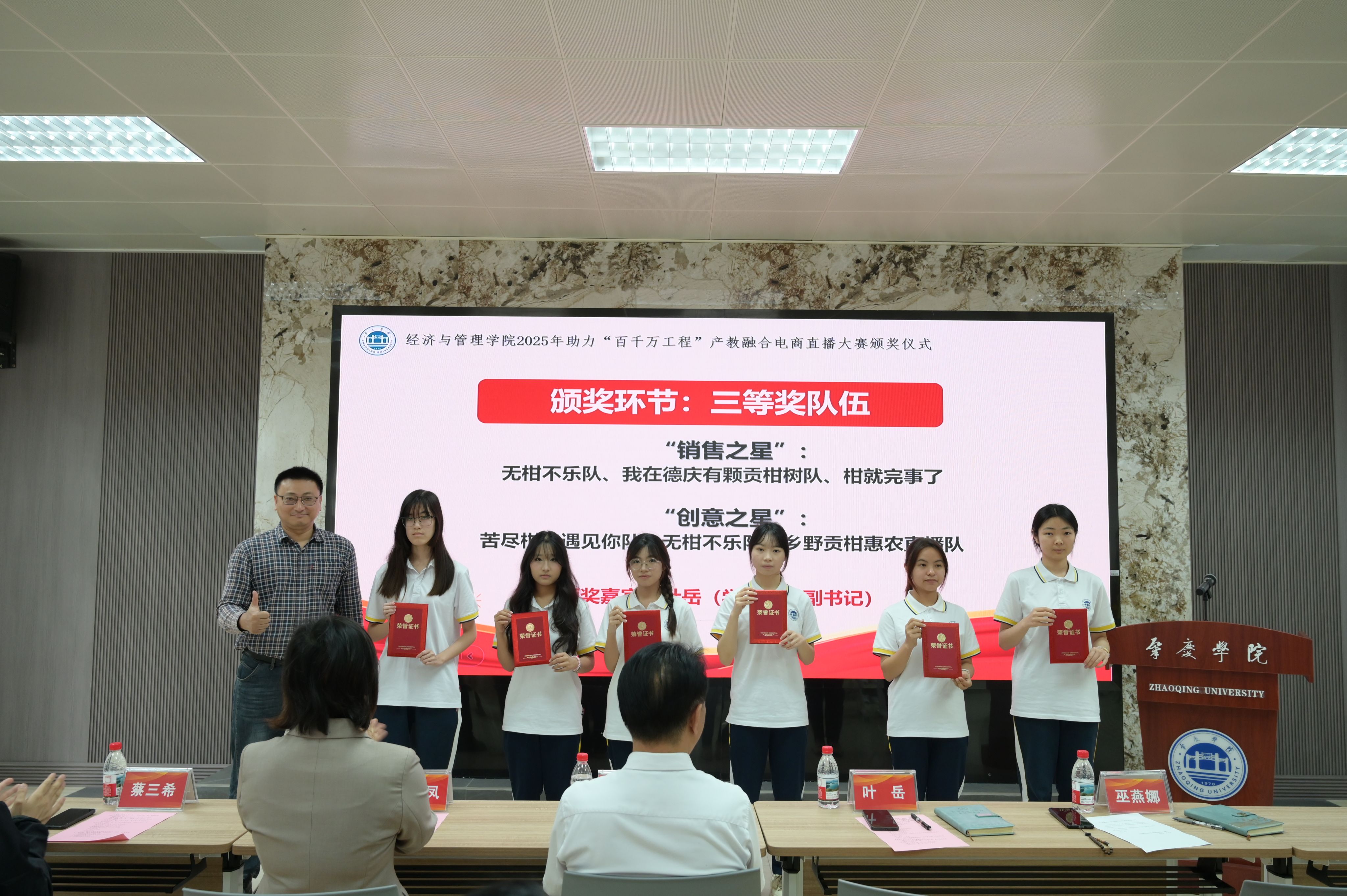 仪式上,还对经济与管理学院2025年助力肇庆德庆“百千万工程”产教融合柑橘直播电商大赛进行了颁奖。获奖队伍代表聚焦德庆贡柑特色产业,实现专业知识与地方发展深度融合进行了分享,为在场师生带来满满干货。