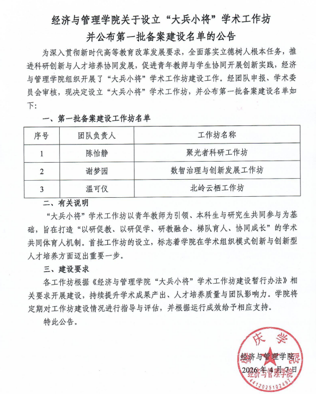 为深入贯彻新时代高等教育改革发展要求,全面落实立德树人根本任务,推动创新型人才培养与学术共同体建设有机融合,促进师生协同开展创新实践与社会服务,经济与管理学院本学期初出台《“大兵小将”学术工作坊建设暂行办法》(以下简称《办法》),并于近日组织开展了项目申报与备案建设工作。