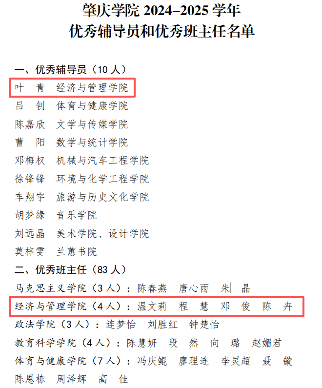 恭喜叶青老师荣获肇庆学院 2024-2025 学年“优秀辅导员”荣誉称号,温文莉等4位老师荣获肇庆学院 2024-2025 学年“优秀班主任”荣誉称号
