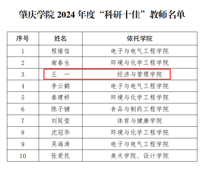 恭喜王一老师荣获肇庆学院 2024 年度“科研十佳”教师荣誉称号