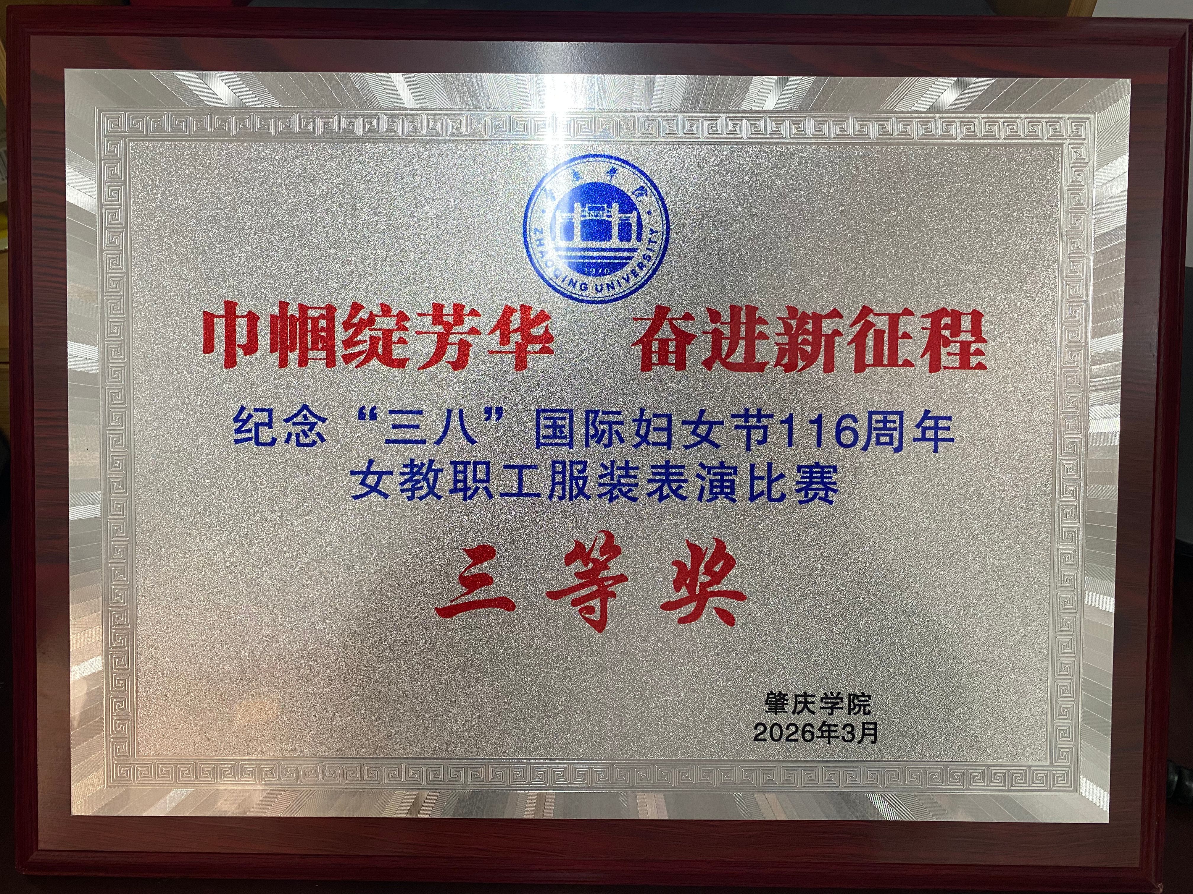 恭喜学院女教职工在肇庆学院纪念“三八”国际劳动妇女节116周年暨女教职工服装表演比赛中荣获三等奖。